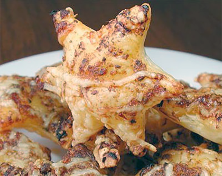 Pesto Pastry Stars: A British recipe for a party snack of puff pastry topped with basil pesto and cheese and cut into star shapes, which makes an excellent nibble for a Christmas or New Year party.