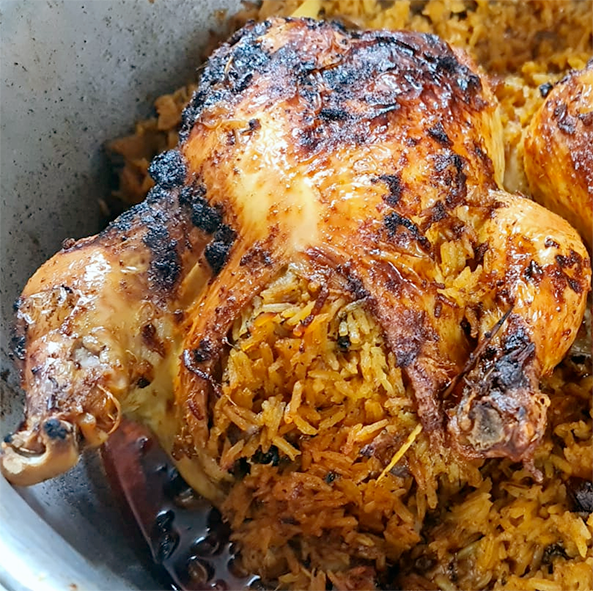 Mix the rice with the diced onion, diced tomatoes, chilies and carrot. Use this mixture to stuff the inside of the chicken (neck and body cavities. Close the openings in the chicken then coat the chicken with the mustard.