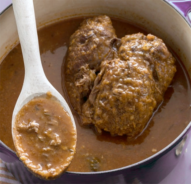 At this point add the finely-chopped mushrooms, their soaking liquid, the tomato pure previously (diluted with 3 tbsp of water), and a tablespoon of flour (blended to a slurry with 3 tbsp water). Pour in enough of the hot stock to come 2/3 of the way up the sides of the meat. Finally add a sprig of rosemary, 3–4 sage leaves and a bay leaf or two.
