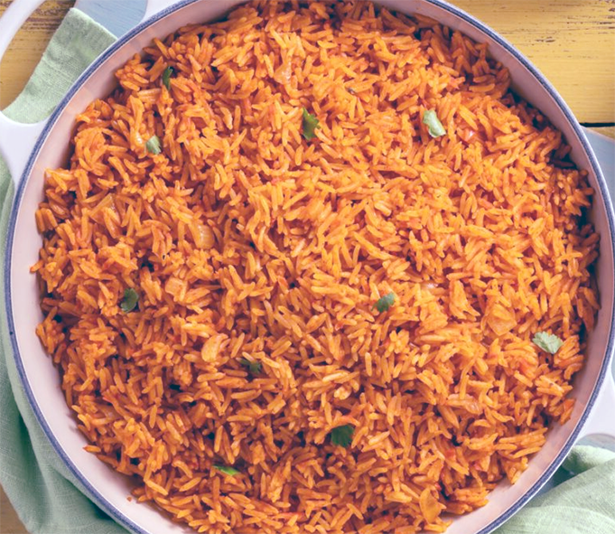 Though the rice itself is vegetarian, it is typically served as an accompaniment to a meat-based stew, though plantain, yam and aubergine stews also work well with it.