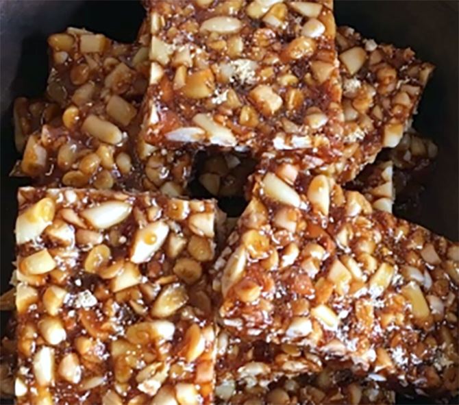 Turn the resultant mixture onto a greased shallow baking tin (or a marble slab moistened with water) and allow to harden. Cut into small slices and serve.