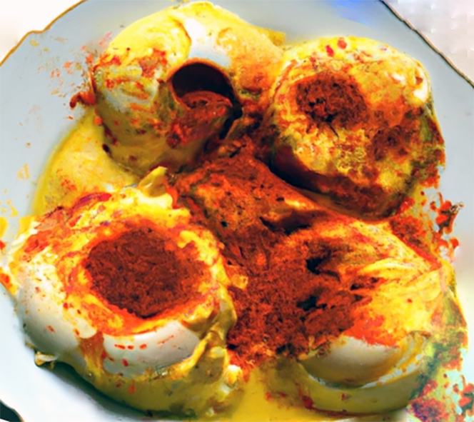 Aijet Beythat (Spiced Eggs) is a traditional Saudi Arabian recipe for a classic starter or accompaniment of hard-boiled eggs fried in lightly-spiced butter that's typically served with pita breads. The full recipe is presented here and I hope you enjoy this classic Saudi Arabian version of: Spiced Eggs (Aijet Beythat).
