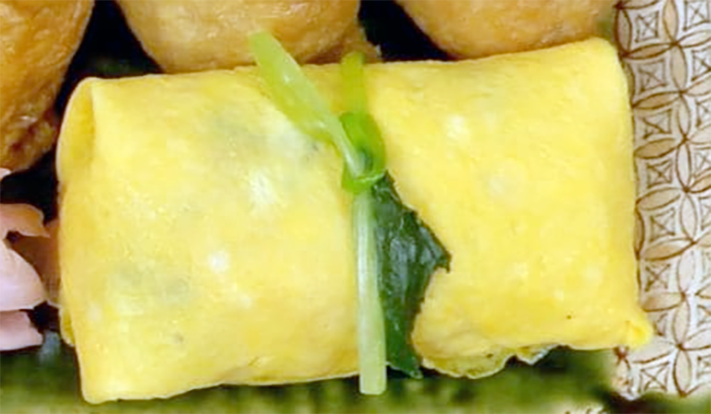 This is a classic chirashizushi style of sushi where a rice, mushroom, king prawn and seaweed mix is tied in a thin omelette using mitsuba stems to tie it closed.