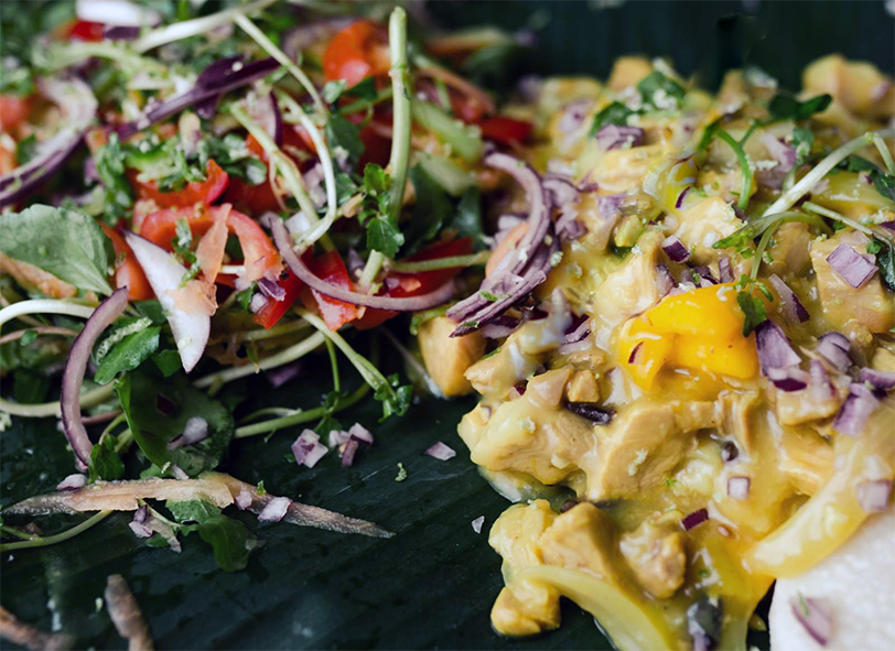 For the Vegetable salad: Dice the papaya, cucumber, tomato, and onions and place into a bowl. Add the watercress and toss lightly.