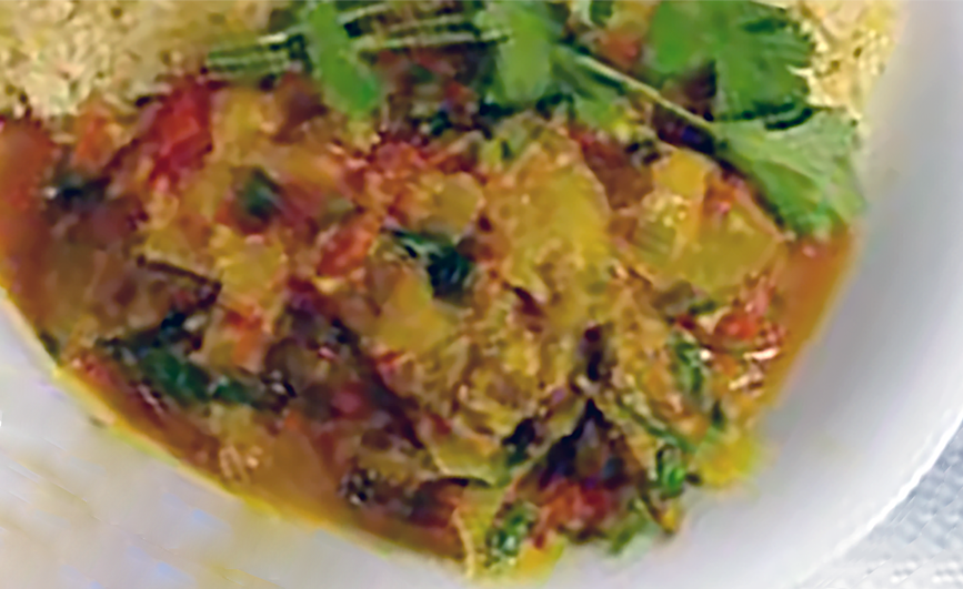 Turn into a warmed serving dish, garnish with the shredded coriander leaves and serve immediately, accompanied by boiled rice and rotis.