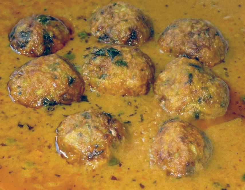 Bottle gourd, known as lauki (ghiya) in Hindi and Dudhi in Gujarati, is generally not that popular a vegetable, as it tends to be bitter if not prepared properly. However, it can be used to prepare on of the best vegetarian Indian curries — Lauki Kofta Curry in which deep-fried koftas are made of grated bottle gourd, gram flour, rice flour and ginger-garlic paste are presented in spicy gravy of tomato and cashew nuts. I was shown these by Indian friends in South Africa (Indian Indian in this case, not South African Indian). We'd gone out to the local weekend vegetable market. I'd made my purchases, including jackfruit, which I love and which will work as a substitute in this recipe, snake gourds, amadumbe and cassava (which they didn't know) when I noticed that they had bought bottle gourds. I told then that I always found it too bitter when I tried to cook it and asked them what they would do with it. A couple of days later I was invited over to see the preparation of this curry. Note that you will need to peel the bottle gourds before starting this recipe.