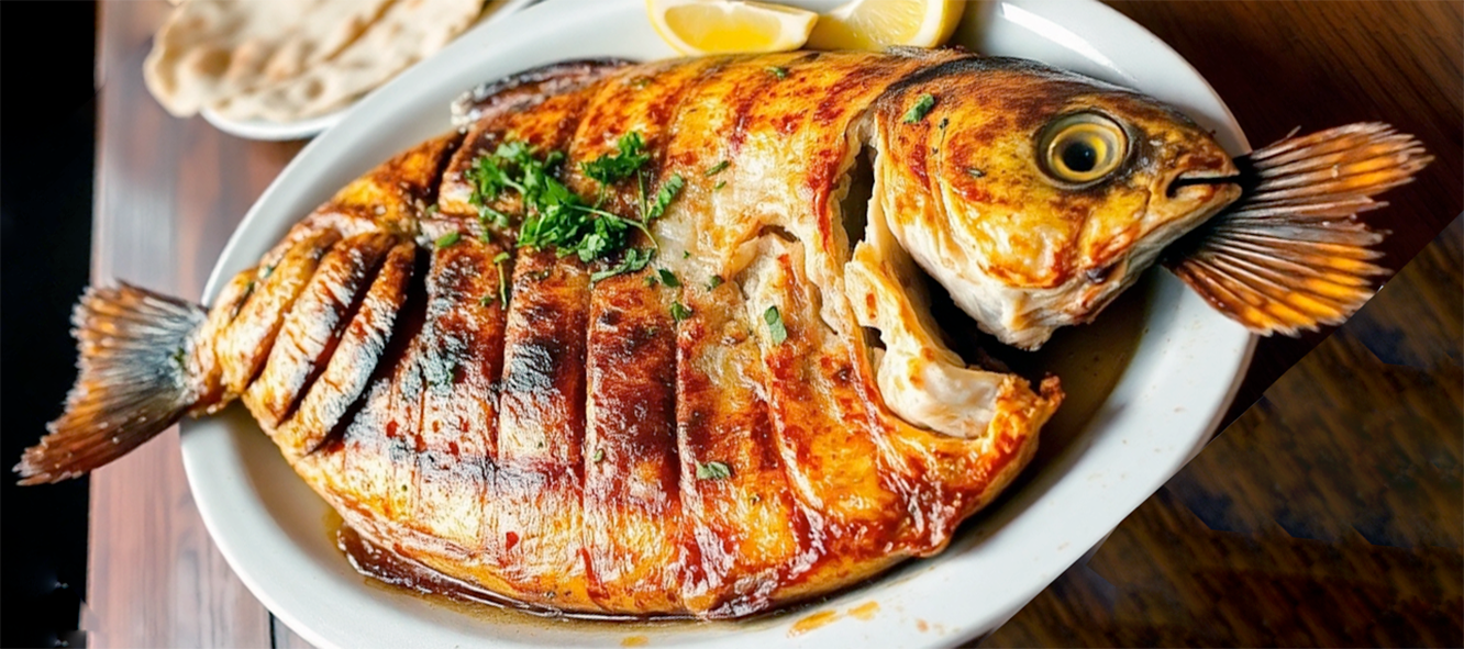 Once the fish is cooked to perfection, transfer it to a warmed serving dish. Garnish with freshly-chopped parsley and coriander, and serve with lemon wedges on the side. The dish is typically enjoyed with warm flatbread (eg khobz) and grilled vegetables for a complete meal.