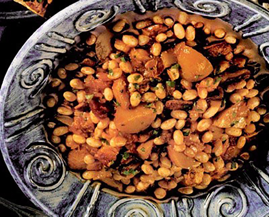 Drain the beans then add to the casserole dish. Bring back to a boil, reduce to a simmer then cover and cook gently for about 90 minutes, or until the beans are tender and the sauce has thickened.
