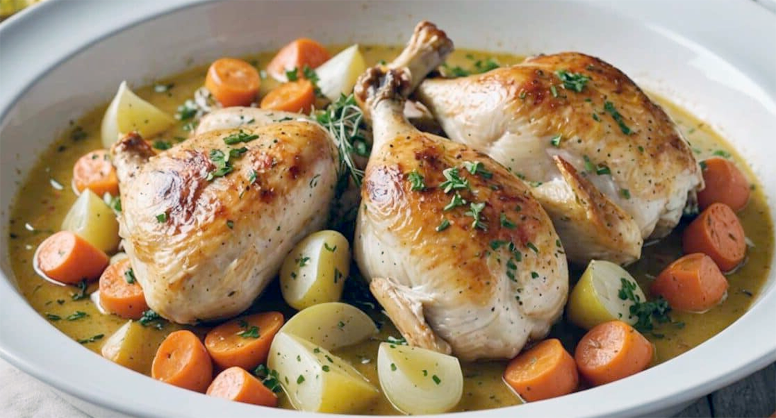 Cook for a further 90 minutes then garnish with the chopped parsley. When ready to serve, transfer the chicken to a warmed plate and carve. Serve the vegetables directly from he casserole.