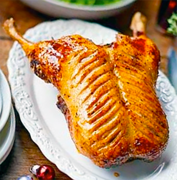 Place in an oven pre-heated to 220°C and roast for about half an hour, or until the skin is crisp and golden.