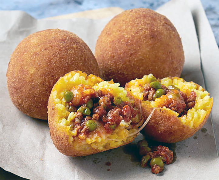 This is a classic Sicilian dish for orange-sized rice balls filled with egg and a chicken giblet, veal and garden pea sauce.