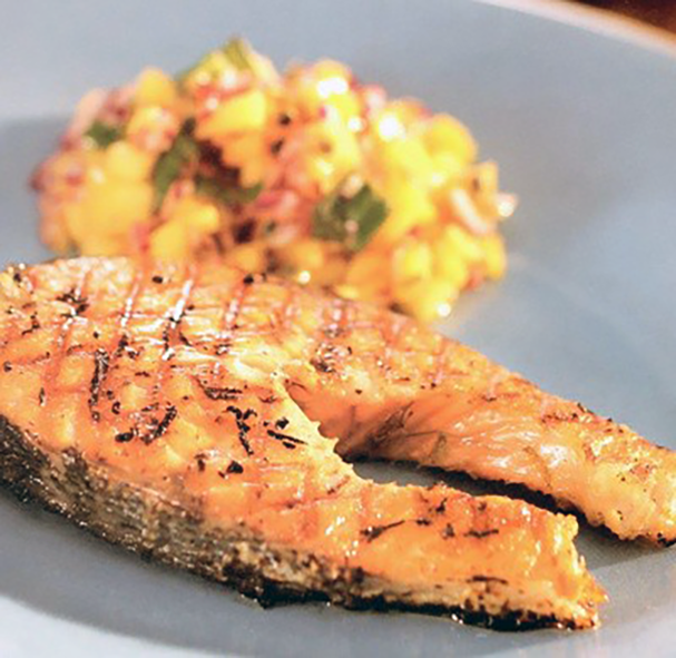 Barbecued Salmon with Mango Salsa: Classic Fusion recipe for a barbecue dish of salmon steaks in a lime dressing served with a mango, red onion and passion fruit salsa.