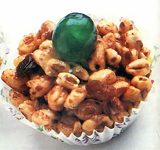 Butterscotch Puffs: A British recipe for a classic sweet (candy) made from puffed wheat and sultanas smothered in butterscotch and served garnished with glace cherries.