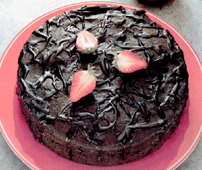 For the topping, melt the carob chips with the butter and just a little water in a pan. Add more water, if needed, to give a pouring consistency. Drizzle this mixture over the top of the cake and allow to set before slicing and serving.