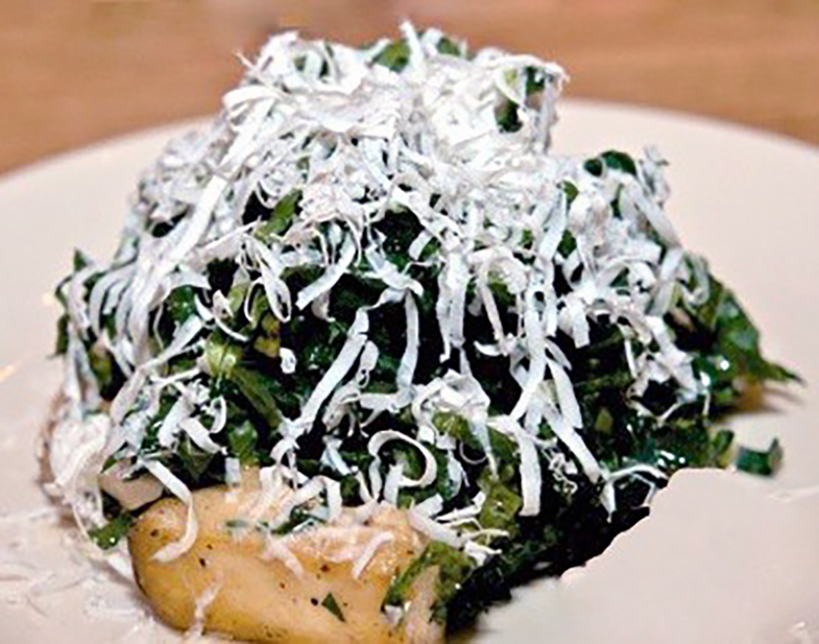 Cavolo Agra (Cabbage with Bacon and Fennel Seeds): Classic Italian recipe for an accompaniment of cabbage and bacon steamed in water with white wine vinegar and fennel seeds served mounded on a bed of fried mushrooms and garnished with grated Parmesan.