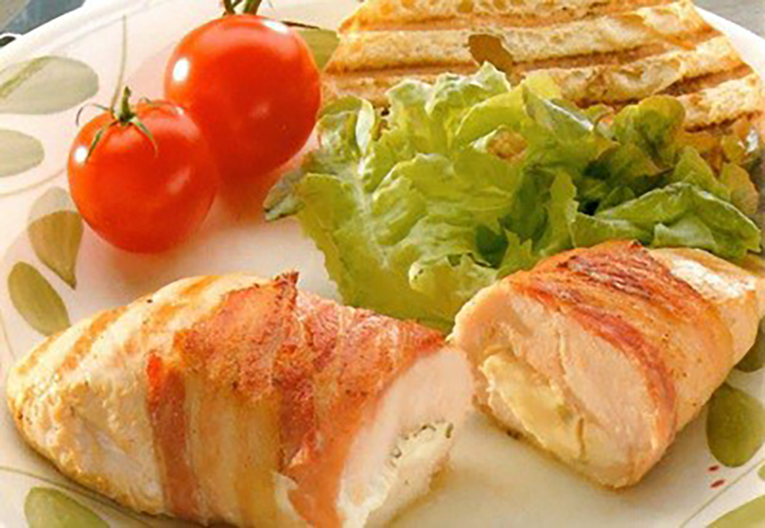 Char-grilled Turkey with Cheesy Pockets a Classic British recipe for a dish of turkey breast pieces stuffed with cheese, wrapped in bacon and cooked on a barbecue and served with garlic bread.