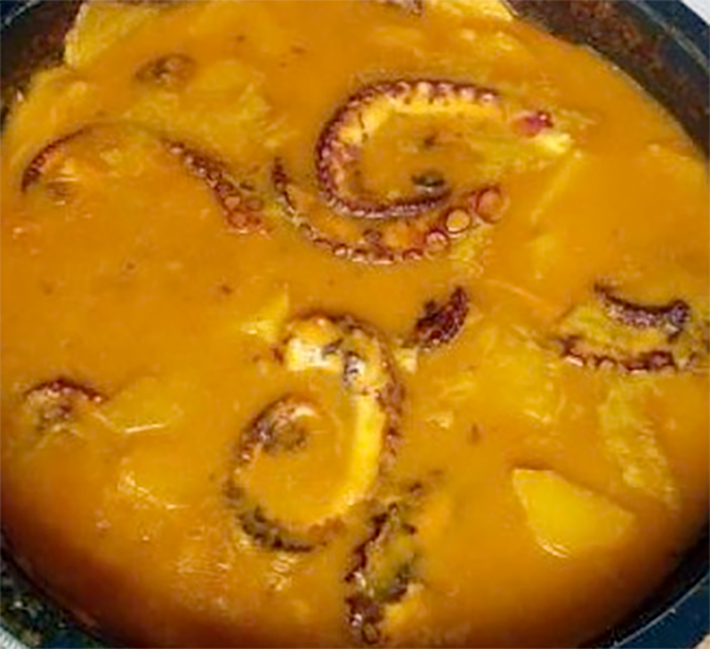 Serve the octopus curry accompanied by boiled taro or rice.
