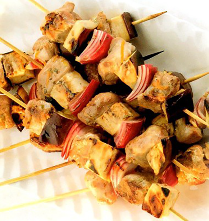 Citrus Duckling Skewers: Classic British recipe for a barbecue skewer of duckling, red onion and aubergine in a citrus marinade.