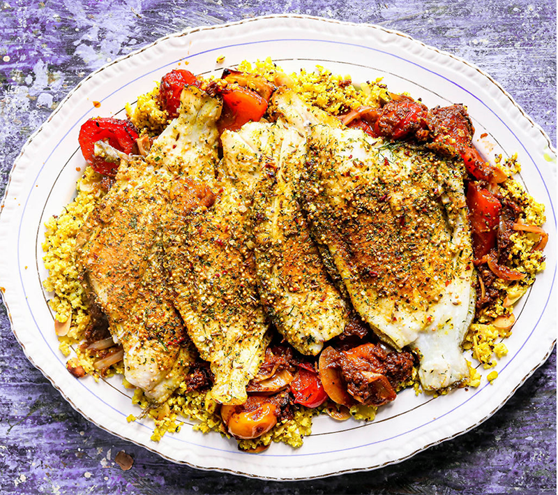 Combine all the ingredients for the spice rub in a bowl, then marinade the Cornish sole fillets in it for 2-4 hours. Preheat your oven to 180˚C.