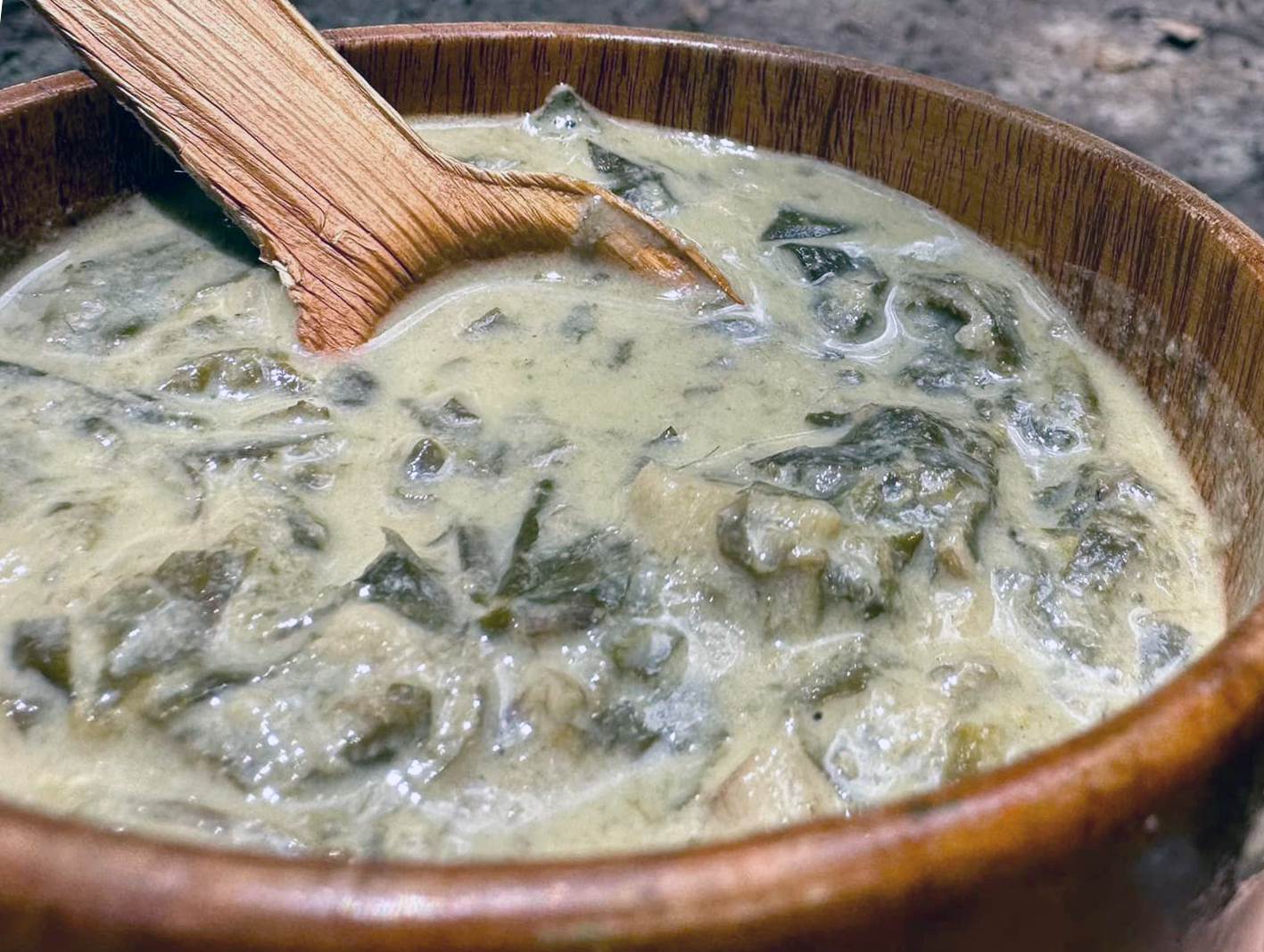 Add the taro leaves and fry briefly then pour in the coconut milk. Bring to a simmer and cook for about 20 minutes, or until the taro leaves are tender.