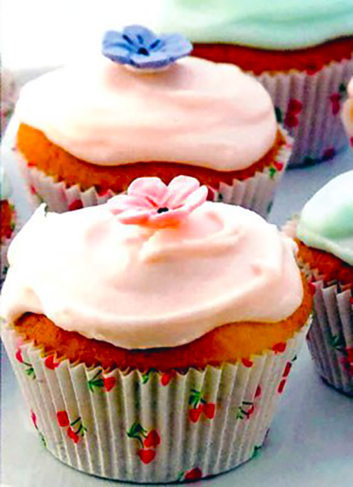 Divide the mixture between three bowls and colour one pink, the second green and leave the final one white. Spread this icing over the top of the cakes then decorate the centres with a sugar flower.