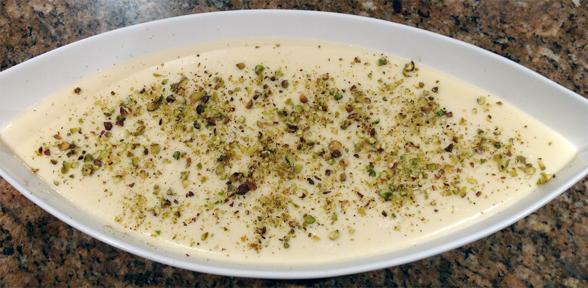 Allow to cool to room temperature then transfer to the refrigerator and chill for at least 2 hours. When ready to serve, garnish with chopped pistachio nuts and bring to the table.