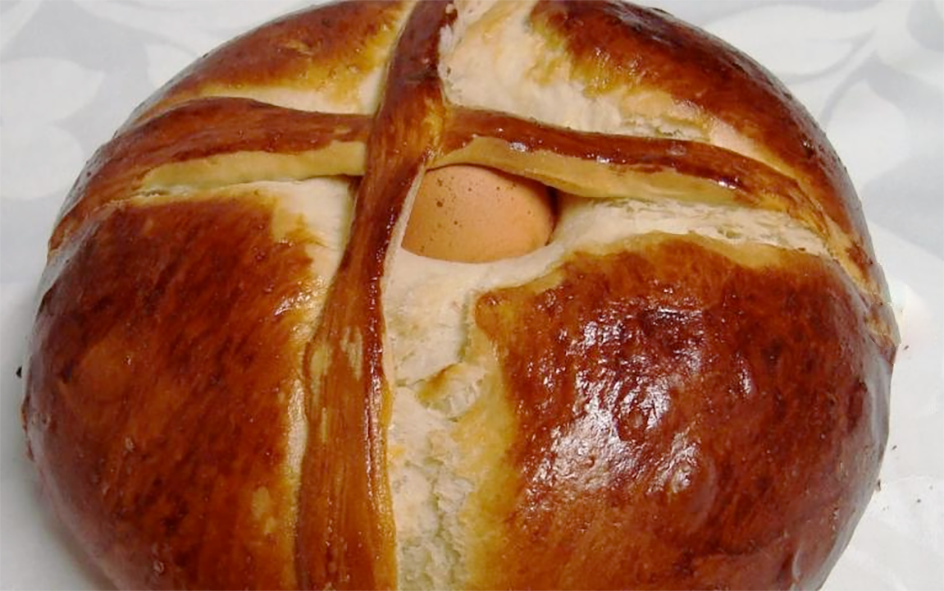 This is a traditional Portuguese Easter bread that typically has an egg baked into the centre that's held in place with a cross of bread dough. Like all these European breads with eggs in them, they hearken back to pagan festivals celebrating the coming of spring (the English name Easter is actually derived from the Germanic goddess, Œstere, goddess of the dawn) where the eggs represented rebirth and the fecundity of spring. The symbology was subsequently absorbed into Christianity to represent resurrection.