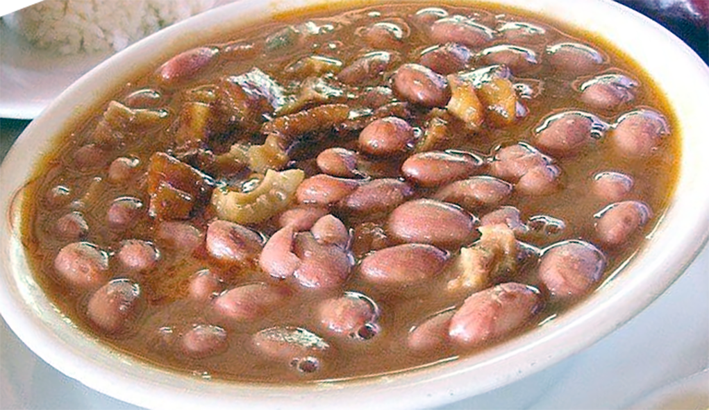 The bean stew is now ready to serve. Accompany with sliced avocado, white rice, sliced plantain, and salad.