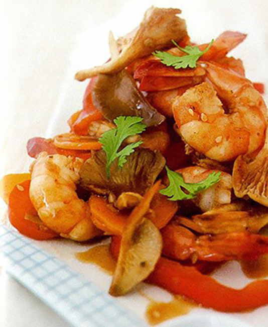 Ginger Prawns with Oyster Mushrooms a Classic Chinese recipe for a stir-fry of prawns, carrots and oyster mushrooms with bell pepper in a sesame, ginger, soy sauce, hot pepper sauce and chicken stock base.