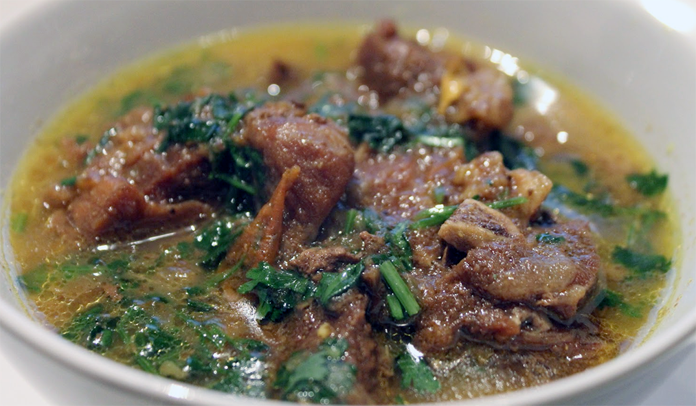This is an interesting variant on the typical ogbono-based pepper soup, where the whole, dried, calabash nutmeg is ground and added to the soup rather than ground ogbono kernels.