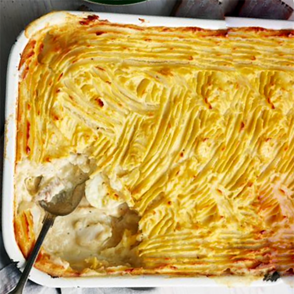 Meanwhile boil the potatoes in salted water for about 20 minutes. Drain the potatoes and mash with a little milk or cream, butter and pepper. Use this to cover the fish and smooth over with a fork. Sprinkle the cheese over the top and return to the oven. Bake for 20-25 minutes, or until top is golden brown. Serve with fresh garden peas.