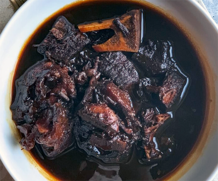 Traditionally, this meat stew is served with mixed, boiled, root vegetables (yams, cassava, sweet potatoes, potatoes, eddoes, carrots).