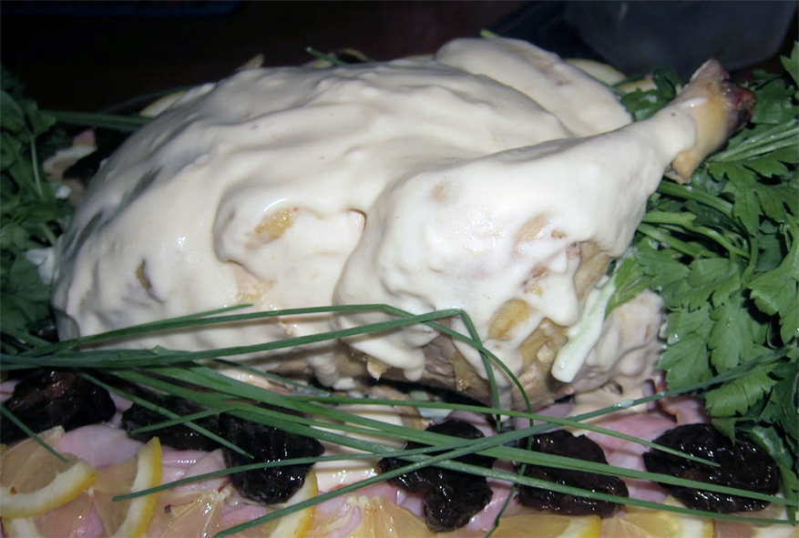 Once the lemon sauce has cooled use to coat the chicken then sprinkle the remaining grated lemon over the top. Decorate with the reserved prune halves, slices of lemon and sprigs of parsley. Serve cold.