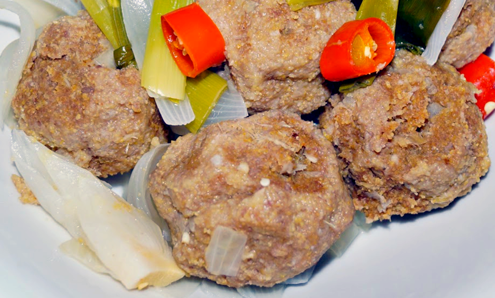 This is a dish of minced beef and polenta with onion, chillies, garlic and ginger that are shaped into balls and steamed to cook.
