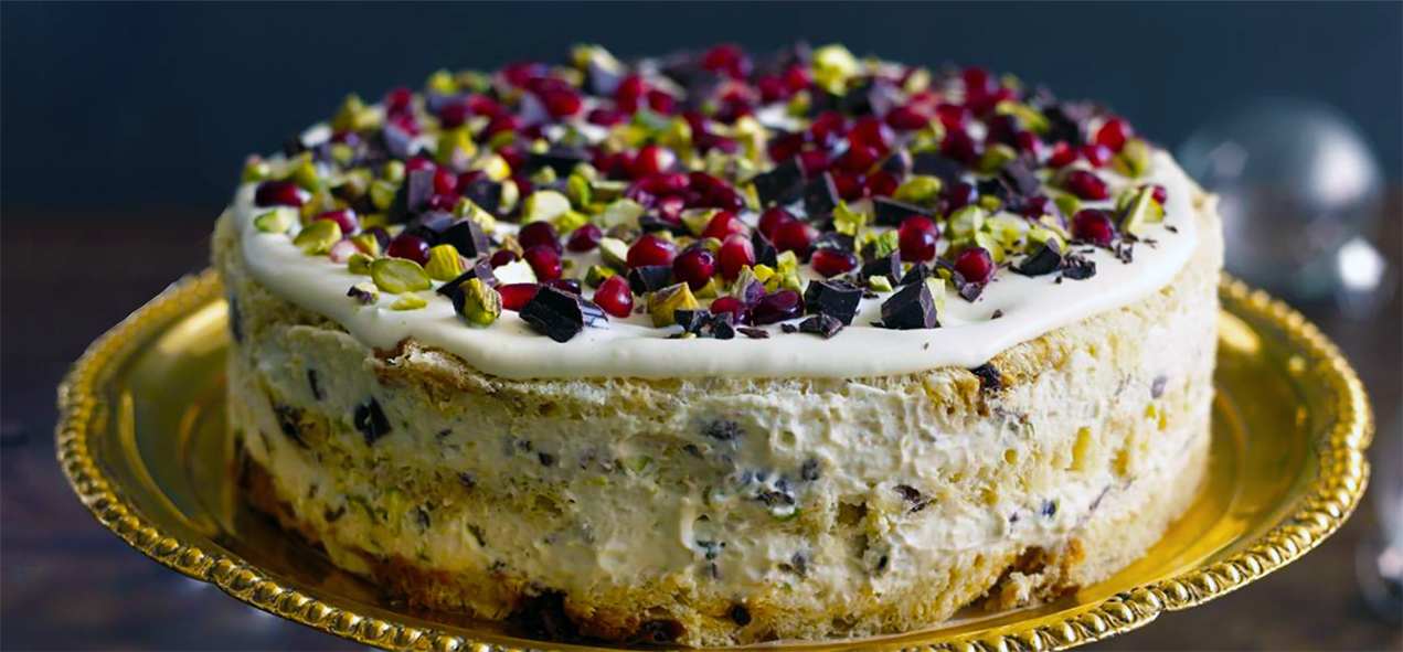 This dessert is garnished with pomegranate seeds (actually arils) for luck on New Year.