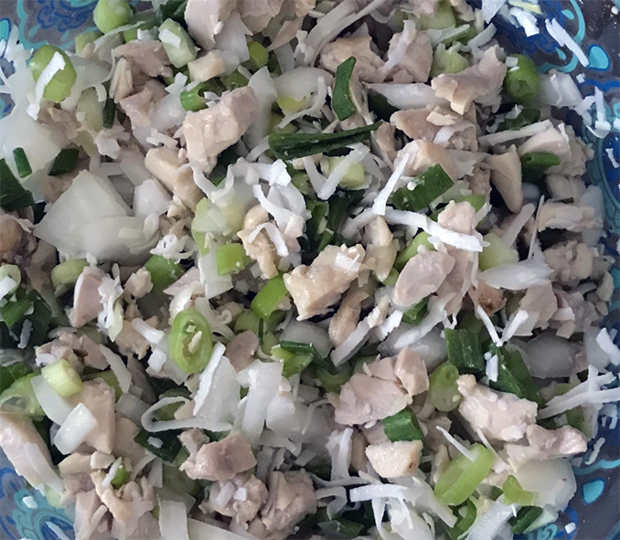 Kelaguen Mannok (Chamorro-style Chicken Salad) is a traditional Northern Mariana Islands recipe for a classic salad-type dish of barbecued chicken meat blended with spring onions, lemon juice, hot chillies and freshly-grated coconut. The full recipe is presented here and I hope you enjoy this classic Northern Mariana Islands version of: Chamorro-style Chicken Salad (Kelaguen Mannok).