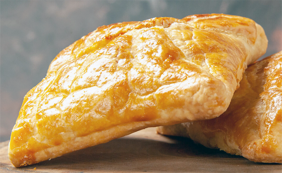 Now fold the square in half then brush the surface generously with melted butter before folding in half again to form a smaller square about 15cm a side (if smaller stretch out slightly by pulling on the edges). Brush the top of the square with butter then take 1/4 of your filling (see below) and shape into a ball. Place the filling in the centre of the dough then fold the corners of the square over the filling, like an envelope. Using the palm of your hand flatten the envelope so it's about 2.5cm thick.