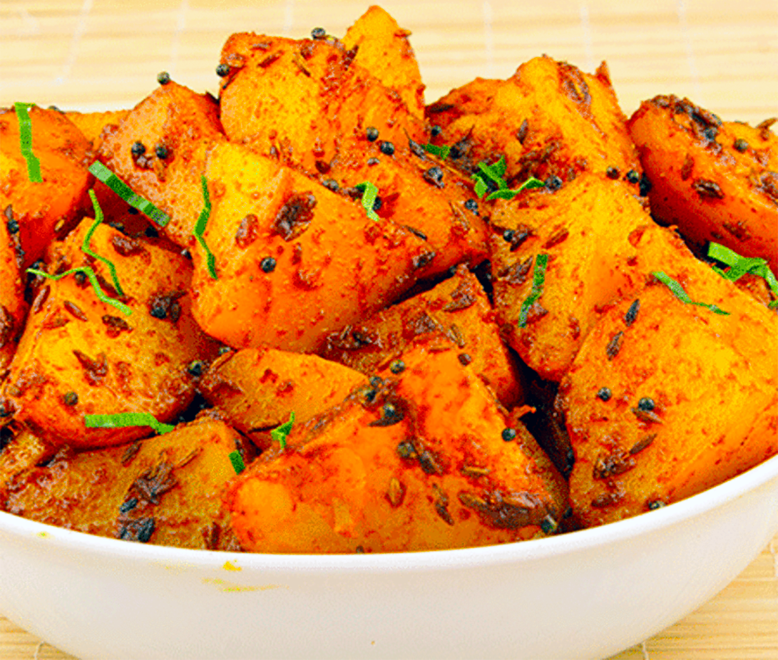 This is a twist on the familiar Bombay potatoes. If you ever want something different to accompany grilled lamb or lamb kebabs this is the recipe for you. In India, these potatoes, that are made tangy with the addition of amchur (green mango powder) are put into children's lunchboxes. Because they can be served both warm or cold; personally, I like to make them ahead of time and serve with braii (barbecue).