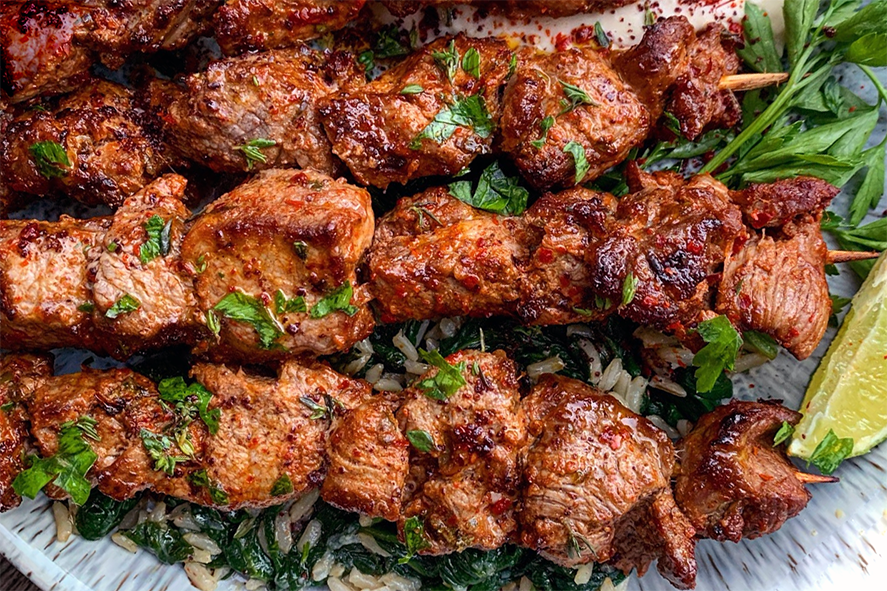 This is a classic of Turkish Cypriot cuisine, skewered meat (typically lamb or chicken) marinated in olive oil, lemon juice, garlic, oregano, cumin, paprika, salt, and pepper and cooked on a barbecue.