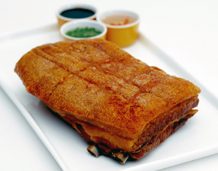 Line a roasting tin with kitchen foil and fit in a roasting rack. Remove the pork from its marinade, sit on the roasting rack (skin uppermost) and pat the skin dry with paper towels. Transfer to an oven pre-heated to 220°C (425F) and roast for between 90 and 120 minutes, until the skin is crisp and puffed up and the internal temperature of the meat has reached an internal temperature of 70°C (155F).