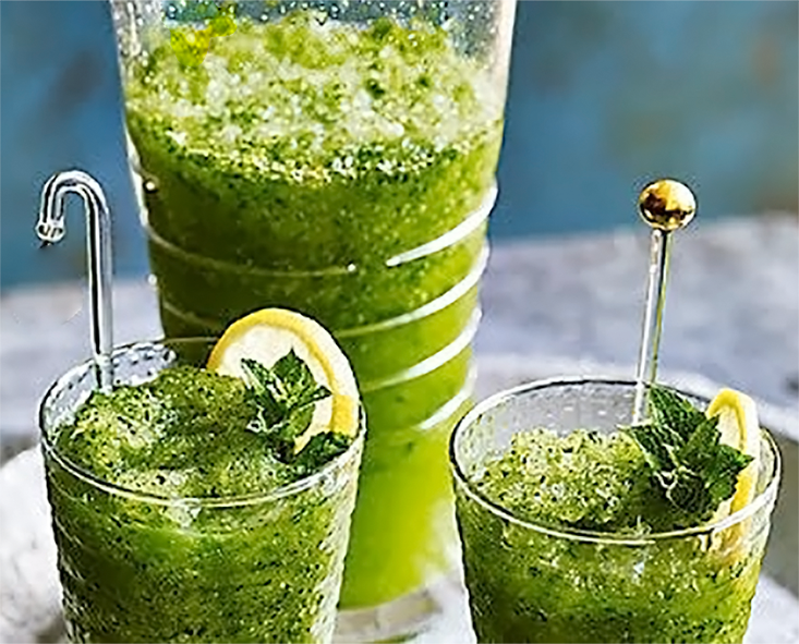Once the syrup is cold place in a blender with the mint leaves and plenty of ice. Blitz the mixture to a slush then divide equally between 4 tall glasses. Top up with sparkling water, garnish with mint sprigs and a slice of lemon and serve.