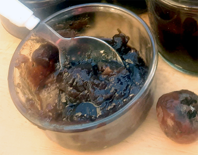 When the fruit is soft add the brown sugar and continue to cook until there is no surface liquid and you can see the bottom of the pan when stirring with the spoon. Take off the heat and allow to cool slightly then put into warm, sterilised jars (I heat mine for 20 minutes in an oven at 90°C). I had enough mixture to fill half a dozen variously-sized jars.