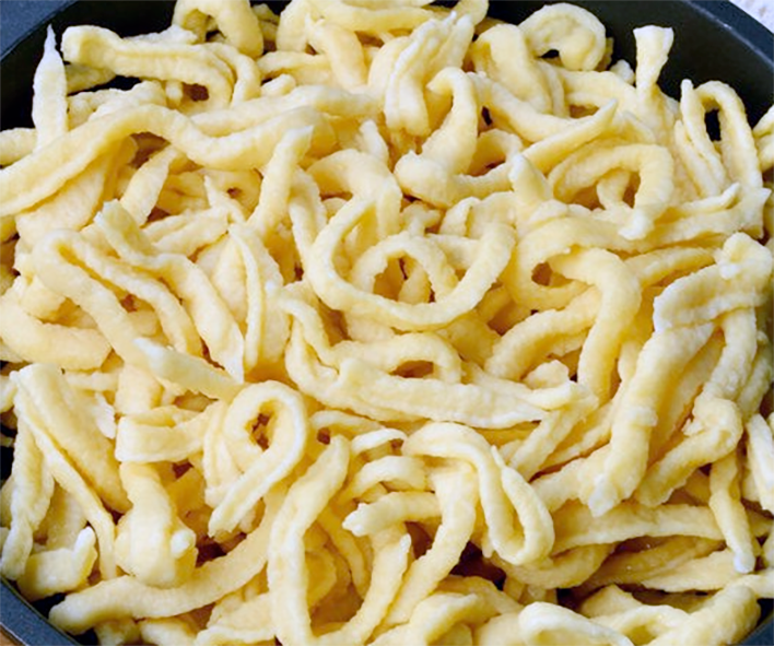 To cook, take a spoonful of the dough and cut off 6mm pieces then add to the boiling stock (you may have to do this by flicking with a knife). Repeat the process until the entire surface of the soup pot is covered with the noodles.