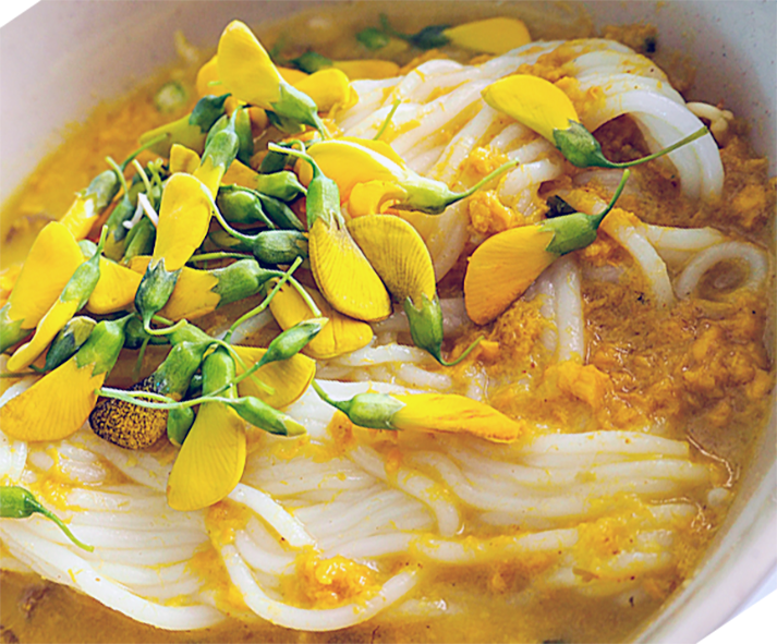 Nom banh chok is a popular Cambodian breakfast dish of freshly-cooked rice noodles and fish curry. Nom banh chok is typically prepared using mudfish, kreung (the citrusy Cambodian curry paste) and coconut milk. The nom banh chok broth is served over freshly cooked rice noodles (known as “Khmer noodles”), crisp raw vegetables, a selection of herbs, and edible flowers. Sesbania is a genus of flowering plants in the pea family, Fabaceae, and the only genus found in tribe Sesbanieae. Riverhemp is a common name for plants in this genus. Notable species include the rattlebox (Sesbania punicea), spiny sesbania (Sesbania bispinosa), and Sesbania sesban, which is used in cooking. Sesbania bispinosa is the species whose flowers are used in Cambodian cuisine.