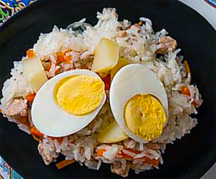 Oshi Palov (Beef and Vegetable Pilau) is a traditional Tajik (from Tajikistan) recipe (also known as 'osh') for a classic pilau of rice, beef and mixed vegetables that is one of the country's national dishes and which is served topped with halved hard-boiled eggs. The full recipe is presented here and I hope you enjoy this classic Tajik version of: Beef and Vegetable Pilau (Oshi Palov).