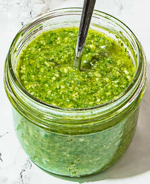 Pesto Petiolata: A traditional Italian recipe for a sauce made from a blend of garlic, garlic mustard, pine nuts, Parmesan cheese and olive oil.