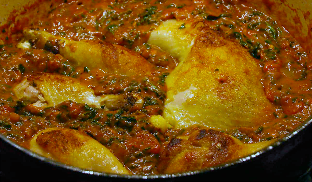 Heat oil in a heavy-based pan or cast iron casserole (Dutch oven) until very hot. Add the chicken pieces and stir-fry until nicely browned and caramelized on all sides (the chicken needs to be darker than usual to lend flavour to the sauce) [about 8 minutes]. Remove the chicken with a slotted spoon and set aside.