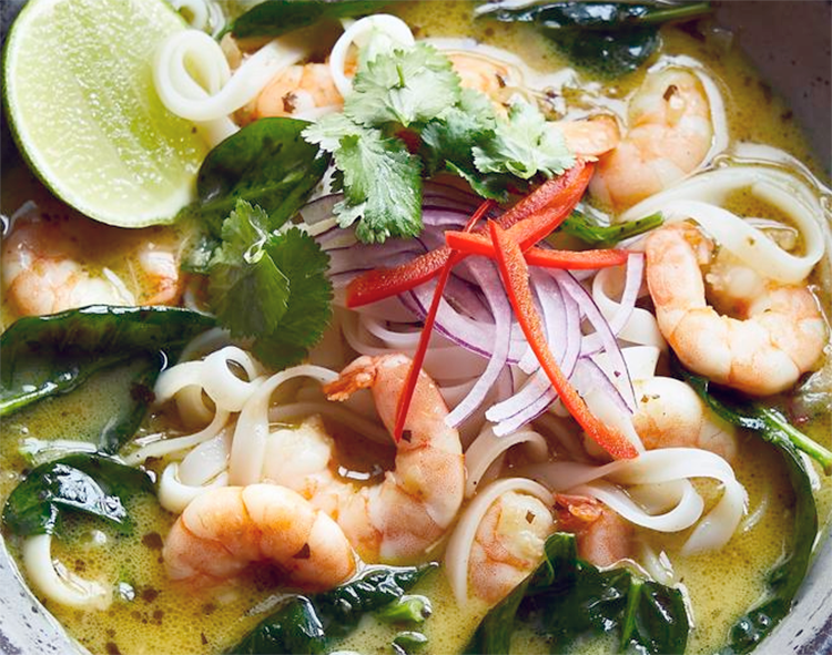 Divide the laksa between two bowls. Top with the noodles, red onion, coriander and chilli.