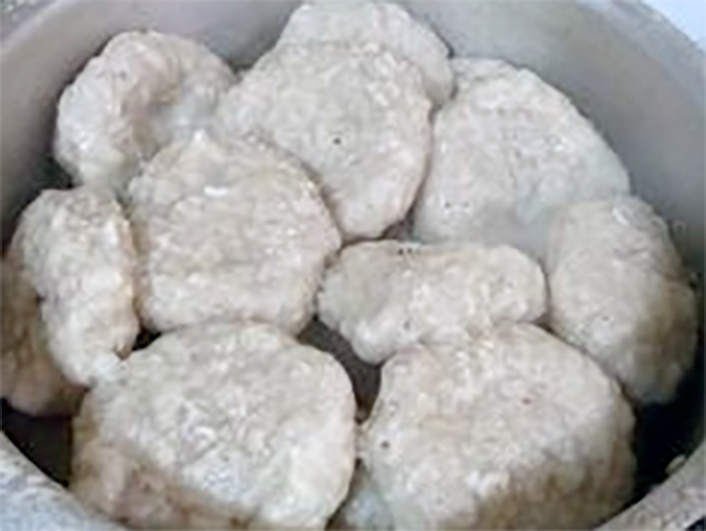Cut of tear gofball-sized pieces from the dough. Roll into a ball then flatten into dumplings.If desired you can press dimples into the top and bottom surfaces with your thumb.