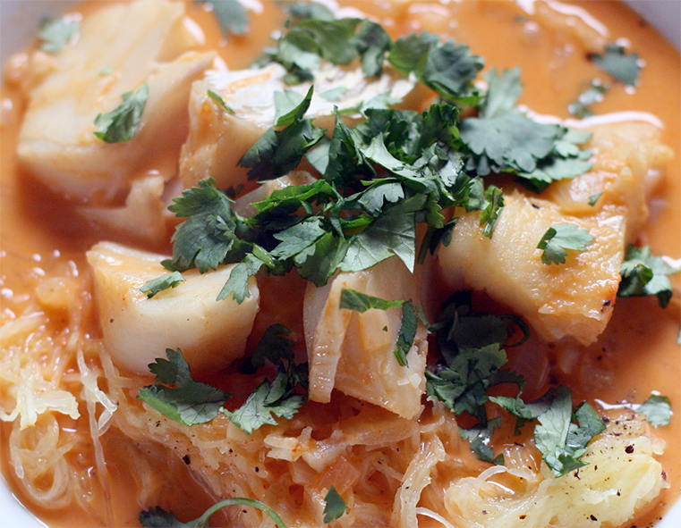 At this point stir in the curry paste and cook, stirring for 30 seconds before pouring in the coconut milk and stirring to combine. Nestle the cod in a single layer (you want the fish covered by the liquid). Bring to a boil over medium-high heat then reduce to medium and cook for about 7–8 minutes, or until the cod flakes easily with a fork.